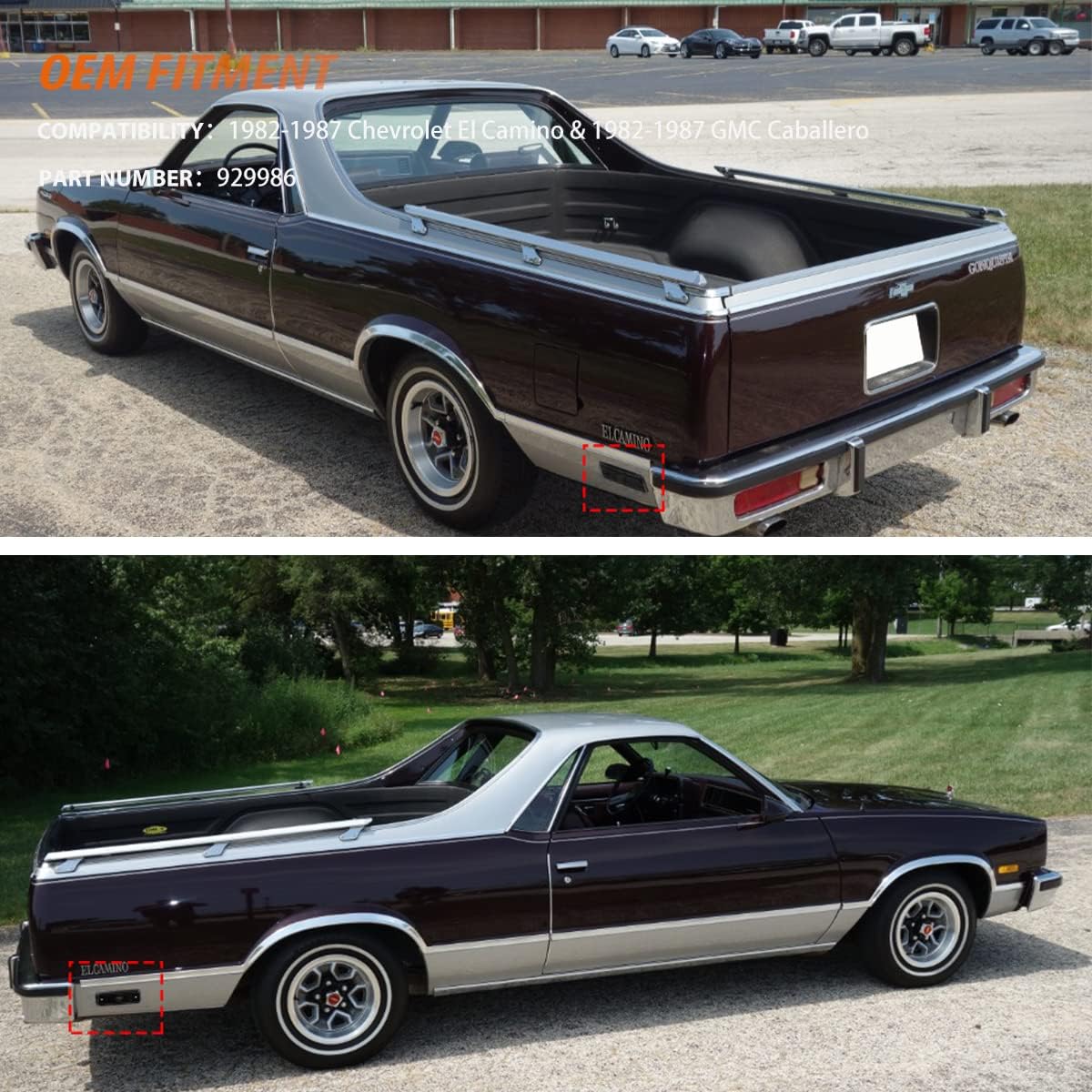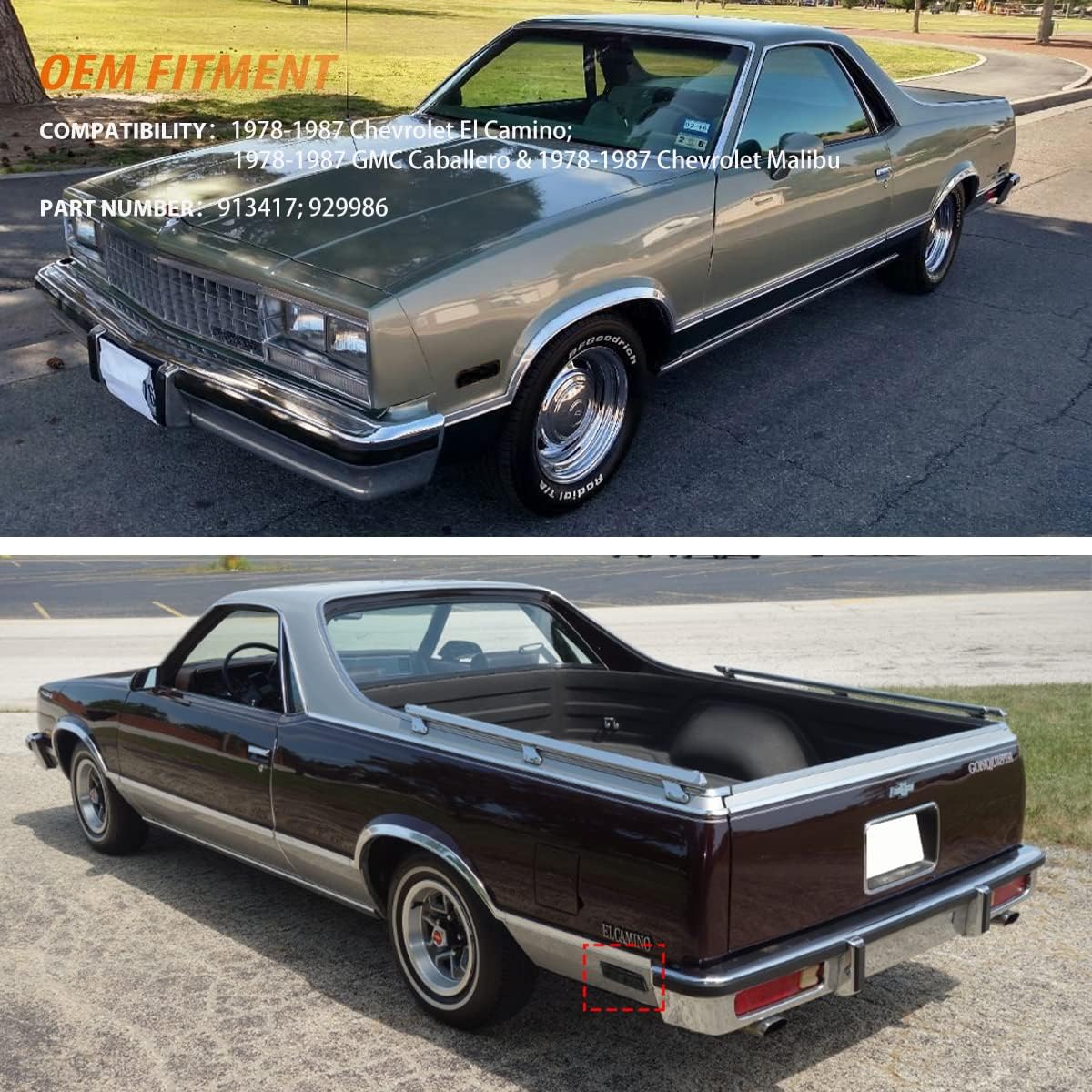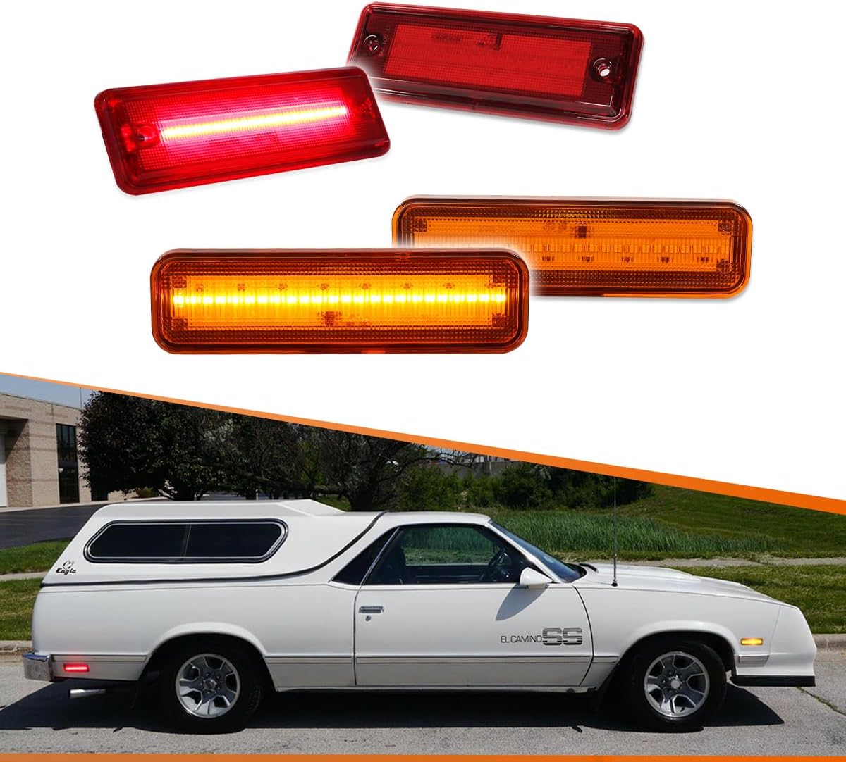 This listing features 1Pair(2 Pieces) red lens rear bumper side marker lights Compatible With:with 1978-1987 Chevrolet El Camino,1978-1987 Chevrolet Malibu, 1978-1987 GMC Caballer.OE/OEM Part Number:923417 .These LED side marker lights are a great way to upgrade your car with superior lighting capabilities that looks great and is way safer.Feature:Lens color:RedHousing Material:Durable Black ABS HousingType:LED front side marker lightsItems Included:2pcs red LED Side Marker Parking LightsWaterproof: IP67Work Temperature:-40 - 60 centigrade degreeInstallation position:Rear Side Marker LampsDirect Replacement, No Modification Required DOT SAE approved.In order to ensure the item fit your vehicle properly, please check our fitting tab, pictures and your vehicle stock OEM part number information carefully and note model name and year on your orderPlease make sure you have available space in your car for these lights to fit before placing order.Installation:Direct replacement the OEM parts without any modification needed.Note: Professional installation is highly recommended!