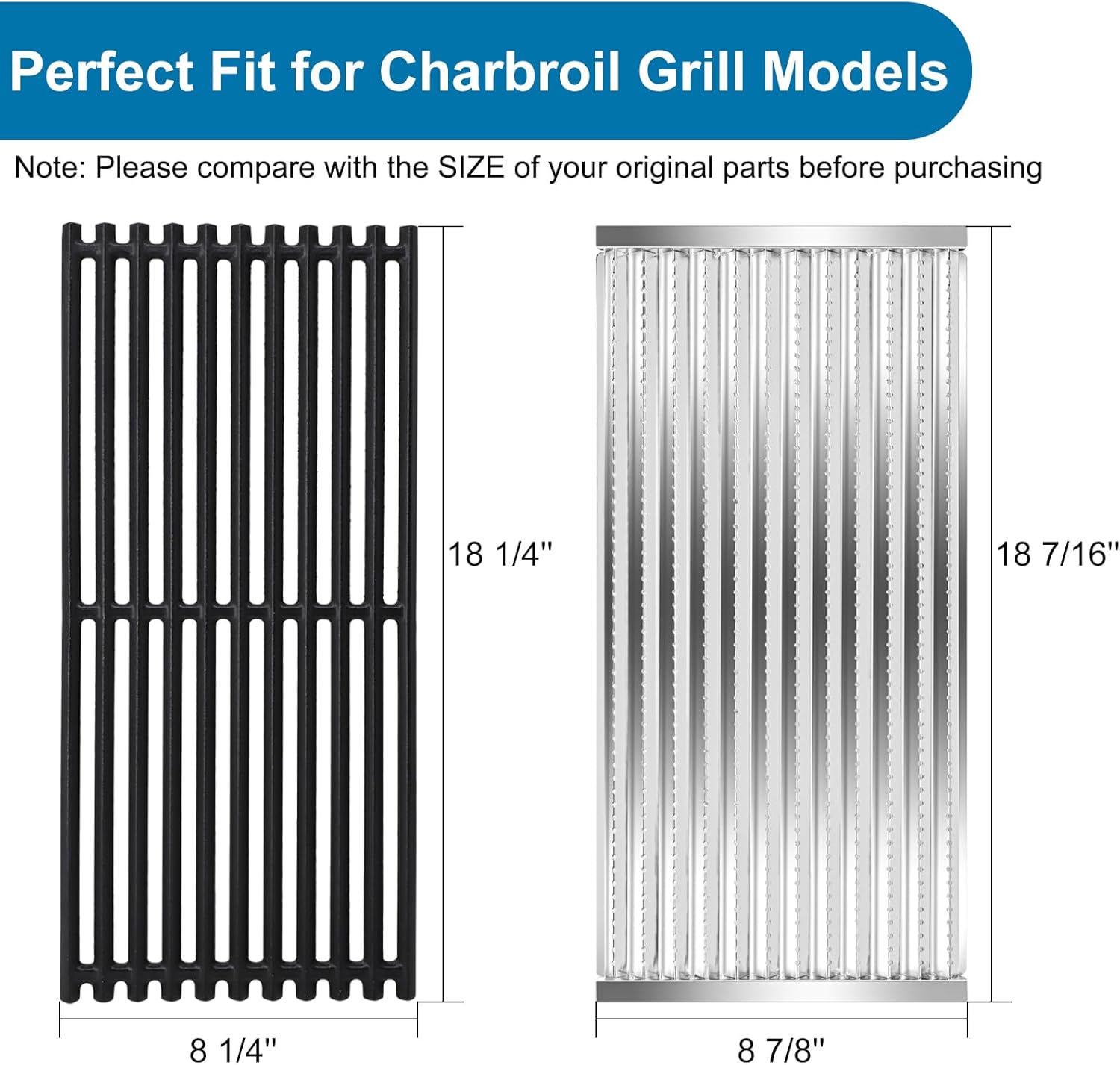 CompatibilityFITS Grill Replacement Parts for ➤Charbroil Precision Flame 2 Burner Grill Models: 463270611, 463270610. ➤Charbroil Performance Flame 2 Burner Grill Models: 463246909, 463270612, 463270613, 463270614, 463243812, 463243911. ➤Charbroil Commerical Series 2 Burner Grill Models: 463246910. ➤Charbroil TRU Infrared 3 Burner Grill Models: 463247412, 463257110, 463271913, 463247109. ➤Charbroil TRU Infrared 4 Burner Grill Models: 463270512, 463247009, 463257010. Package IncludesHis grill parts kit for charbroil 463257110 comes with 17 pieces of replacement parts totally: ➤2 heat tents➤2 burners➤2 ignitors➤1 carry over tubes➤2 Grill Emitter Plate➤2 Cooking GrateProduct Specification【Porcelain Steel Heat Plates】 16" X 3 13/16"; ★【Stainless Steel Burner Tubes】15 15/16" X 1"; 【Crossover Tube】Adjustable extends from 5" - 9"【Length of Igniters Wire】90.5cm/35.6inch【Char-broil Tru-Infrared Emitter & Cooking Grate Kit】Size: 18 7/16" x 8 7/8" Each, 18 7/16" x 26 5/8" for Total.